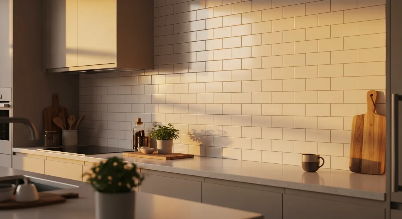 Pour les cuisines au style plus traditionnel, la faïence adhésive blanche ou crème reste un choix pertinent. L'adhésif reproduit le format carré classique (10x10, 15x15 ou 20x20 cm) avec un aspect émaillé très convaincant. C'est sobre, propre, lumineux - et ça se combine facilement avec n'importe quel style de mobilier.